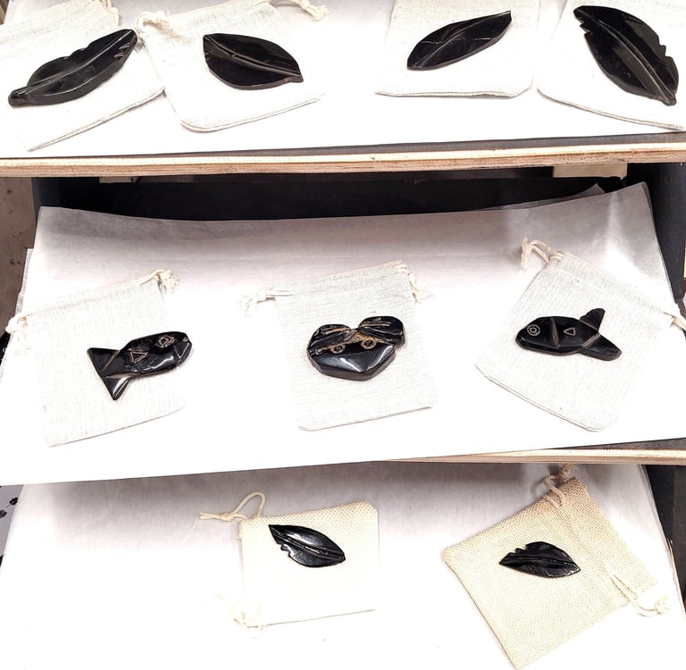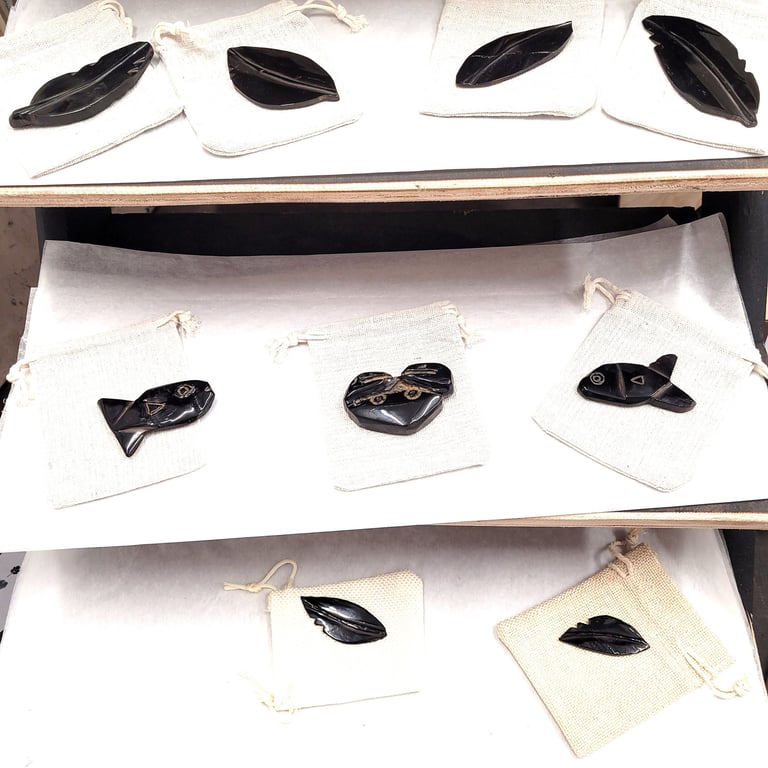 He also carves locally found jet into village scenes, fish and feathers and we look forward to seeing his many skills with carving and collage work developing through the season