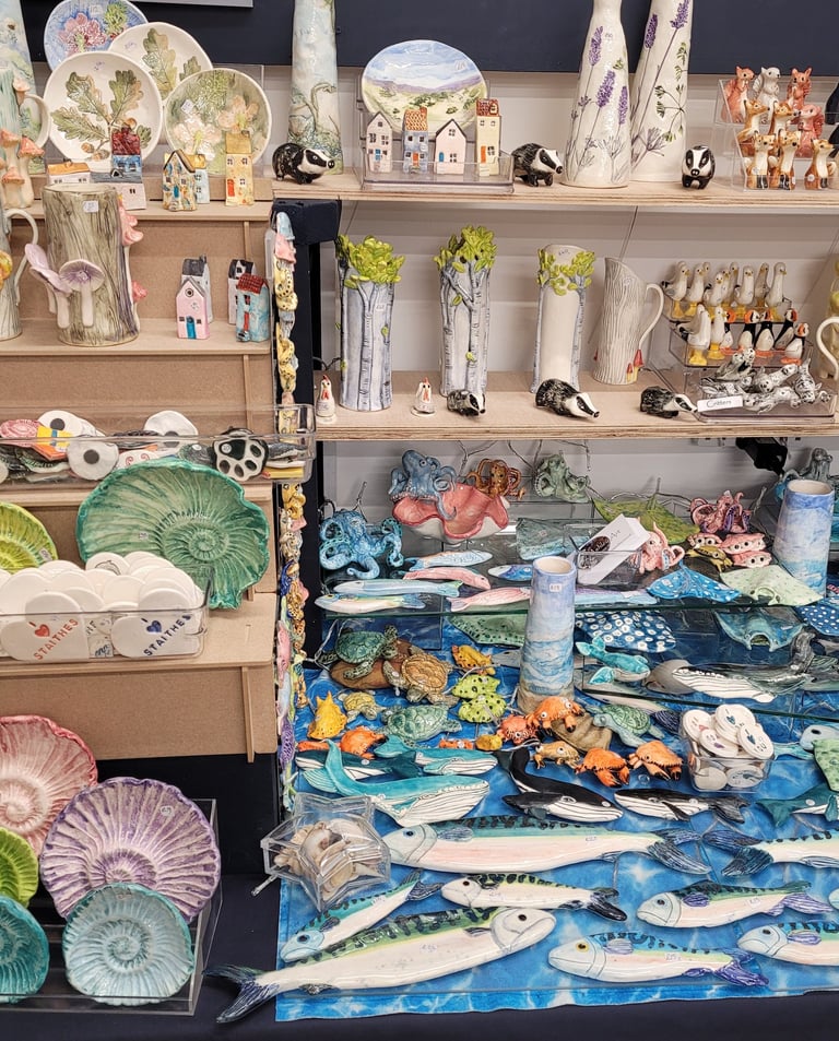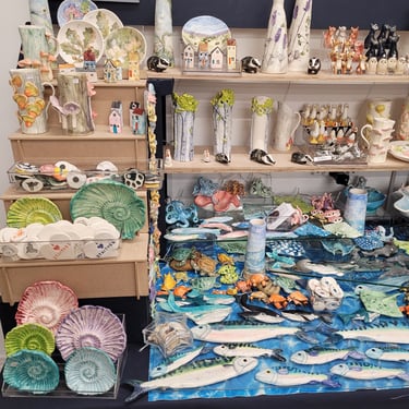 The ceramics on sale in the Staithes Craft Centre range from traditional thrown ware to whimsical animals and fun pieces. She specialises in hand-building and imprinting vases, dishes and other objects.